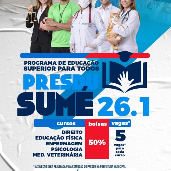 A Prefeitura Municipal de Sumé, em parceria com a UNICIR – Faculdade do Cariri Paraibano, anuncia o edital do Programa de Educação Superior para Todos (PRESDU), com bolsas de 50% para estudantes residentes no município. É a sua chance de