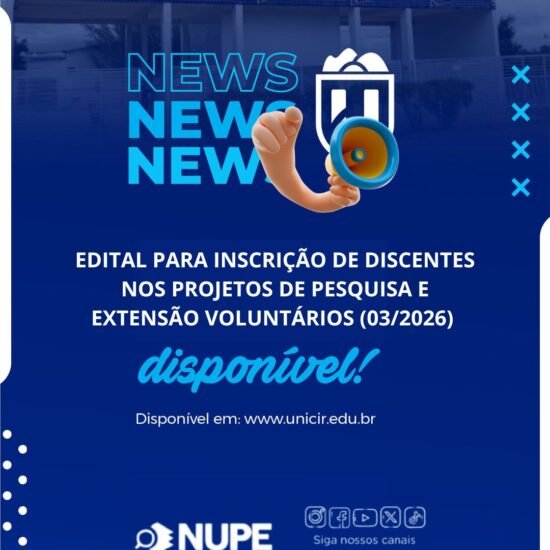 📢 EDITAL – NUPE | PROJETOS DE PESQUISA E EXTENSÃO (2026.1)A UNICIR, por meio do Núcleo de Pesquisa e Extensão (NUPE), divulga a abertura das inscrições para discentes interessados em participar de projetos voluntários de pesquisa e extensão no semestre