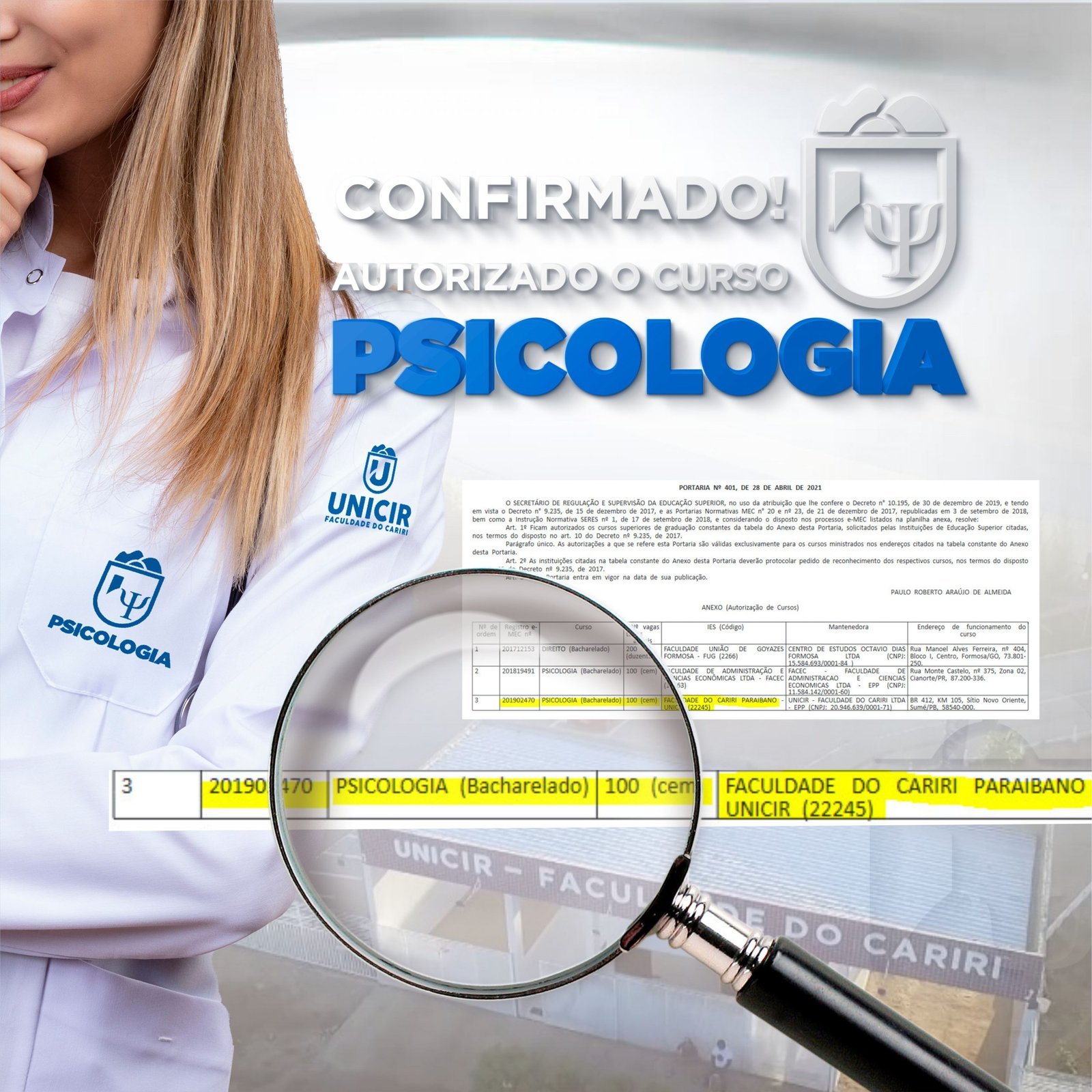 Autorizado pelo MEC, novo curso de Psicologia da Unicir - Faculdade do Cariri em Sumé-PB.Mais uma conquista durante a expansão acadêmica da Unicir - Faculdade do Cariri Paraibano, dessa vez com a autorização por meio da Portaria do Ministério da
